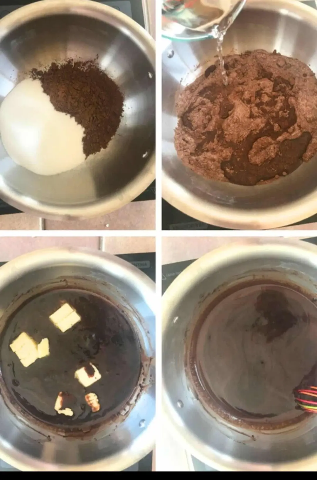 1. شربت شکلاتی: پودر کاکائو و شکر را مخلوط کنید، آب اضافه کنید و روی حرارت هم بزنید تا بجوشد. کره را اضافه کنید و 5–7 دقیقه بجوشانید. بگذارید خنک شود.