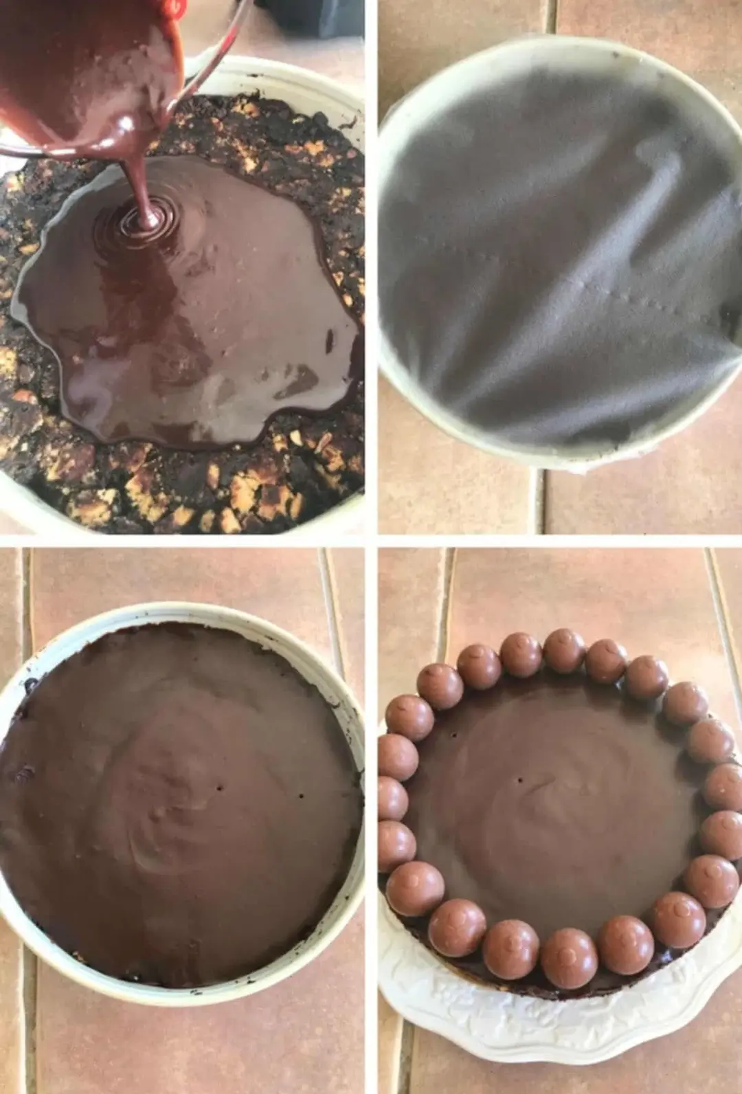 2. مخلوط بیسکویت: بیسکویت‌ها را خرد کنید، شربت و فندق را اضافه کنید و خوب مخلوط کنید. در قالب فنری 9 اینچی با کاغذ روغنی بریزید و 30 دقیقه در یخچال بگذارید.